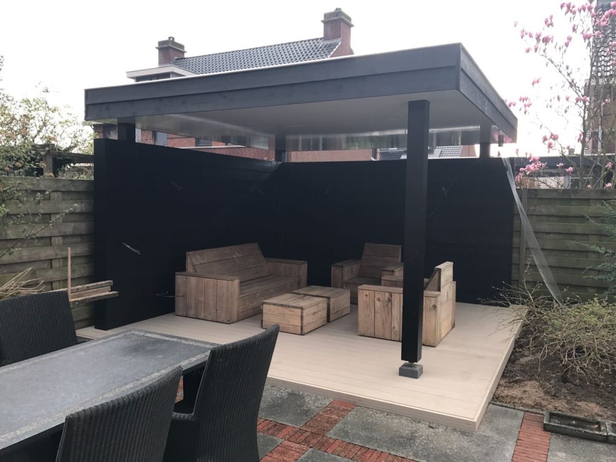Traditionele houten overkapping over het terras, met stoere zwart rabat boeilijsten.
