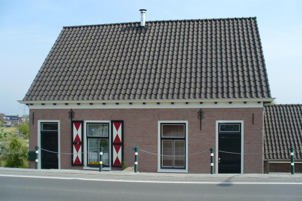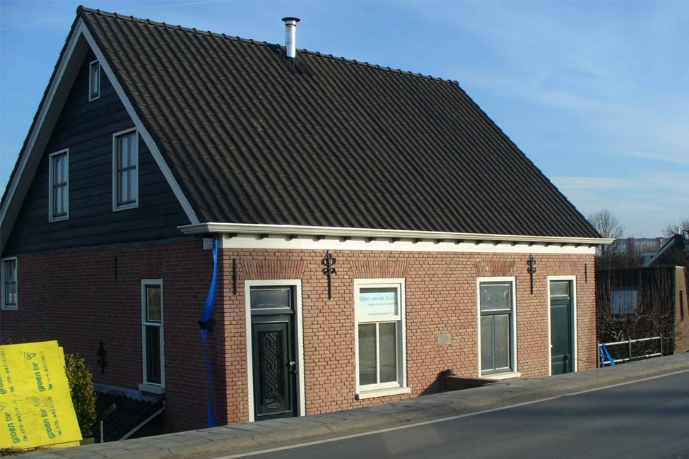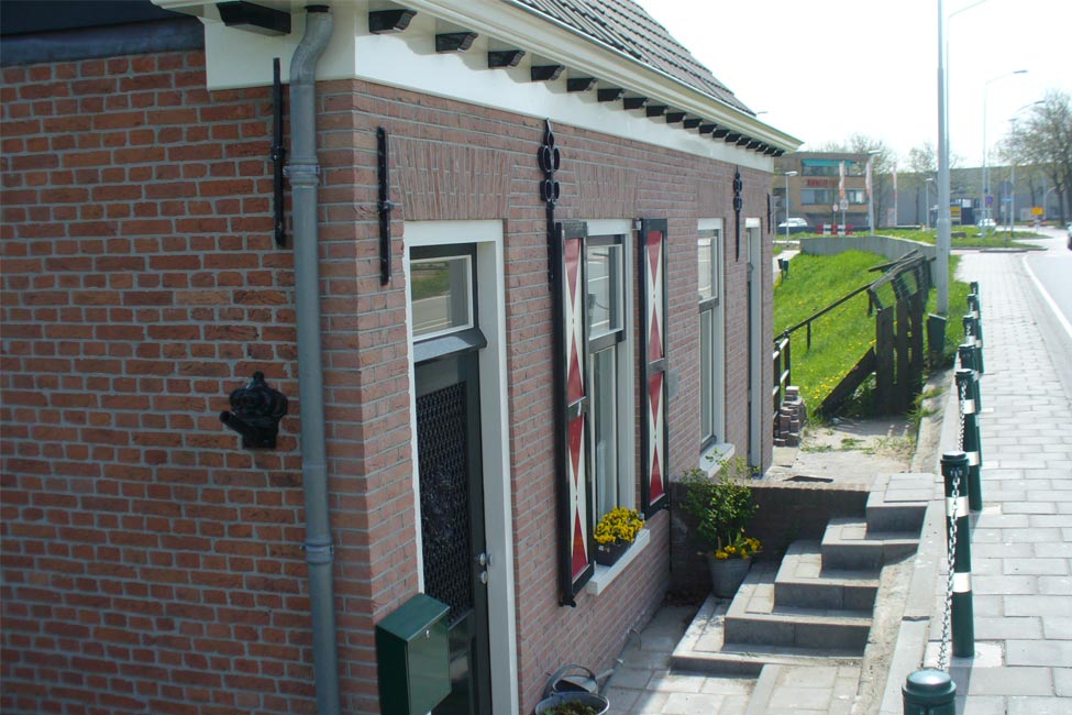 Vernieuwen van de voorgevel van een dijkwoning aan de Burg. Keijzerweg te Papendrecht in opdracht van verzekeraar na een auto ongeluk. Sierlijk metselwerk met knipvoegen en zgn. hanekammen boven de kozijnen.