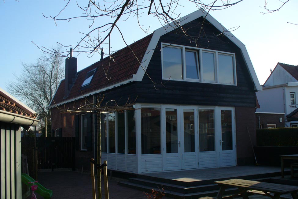 Verlenging van een woonhuis als uitbreiding van de binnenruimte, aan een woonhuis te Hardinxveld. Door de openslaande deuren kom je op het door ons aangelegde hardhouten terras, met een afstap naar de tuin.